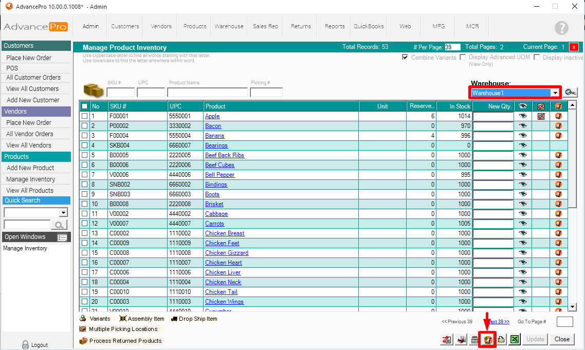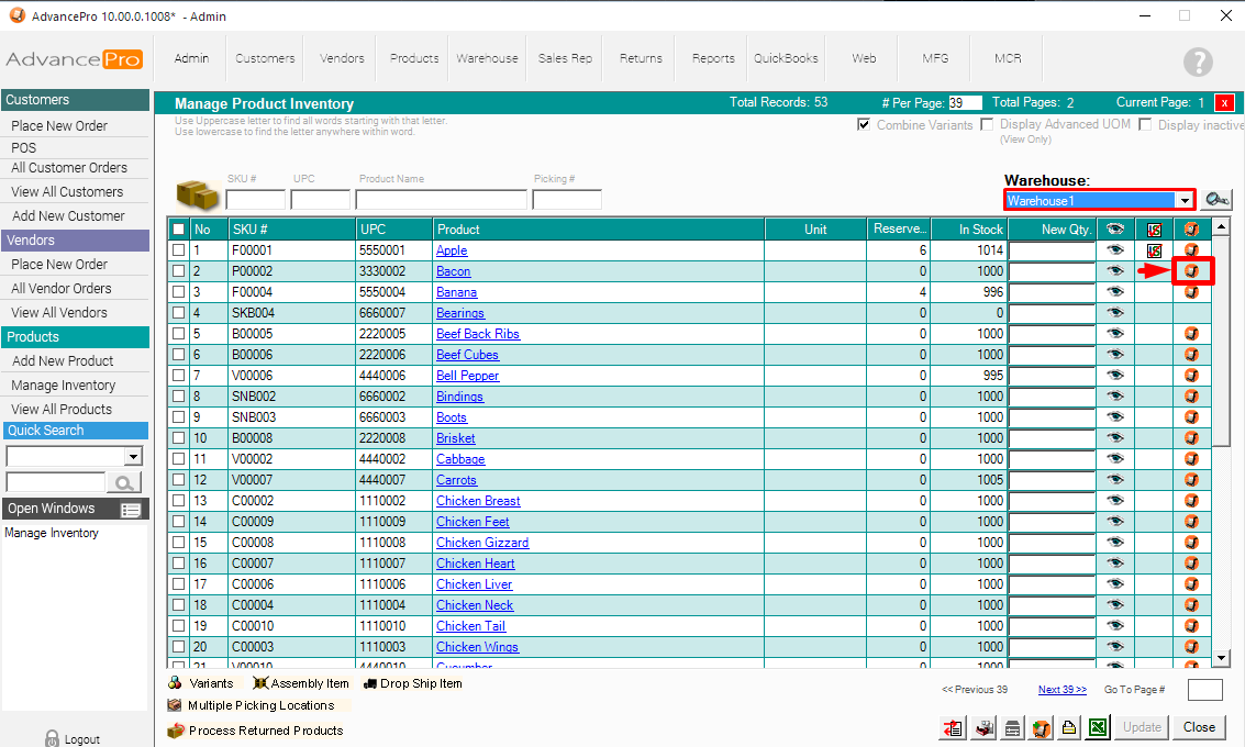 3. Locate the product and click on the Warehouse Icon (AdvancePro Logo)