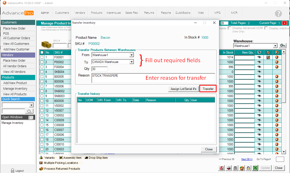 4. Select the "WH To" field (Warehouse Transfer To), Add the products and their corresponding transfer quantities, Add a reason for transferring. Click Transfer when ready.