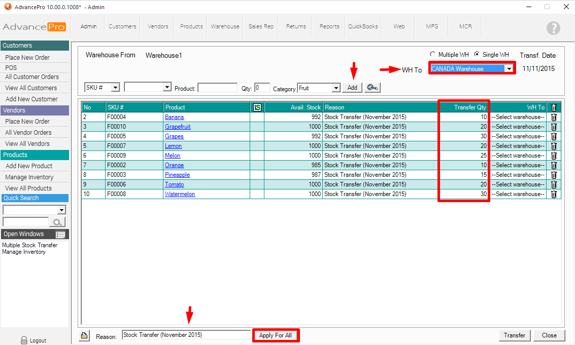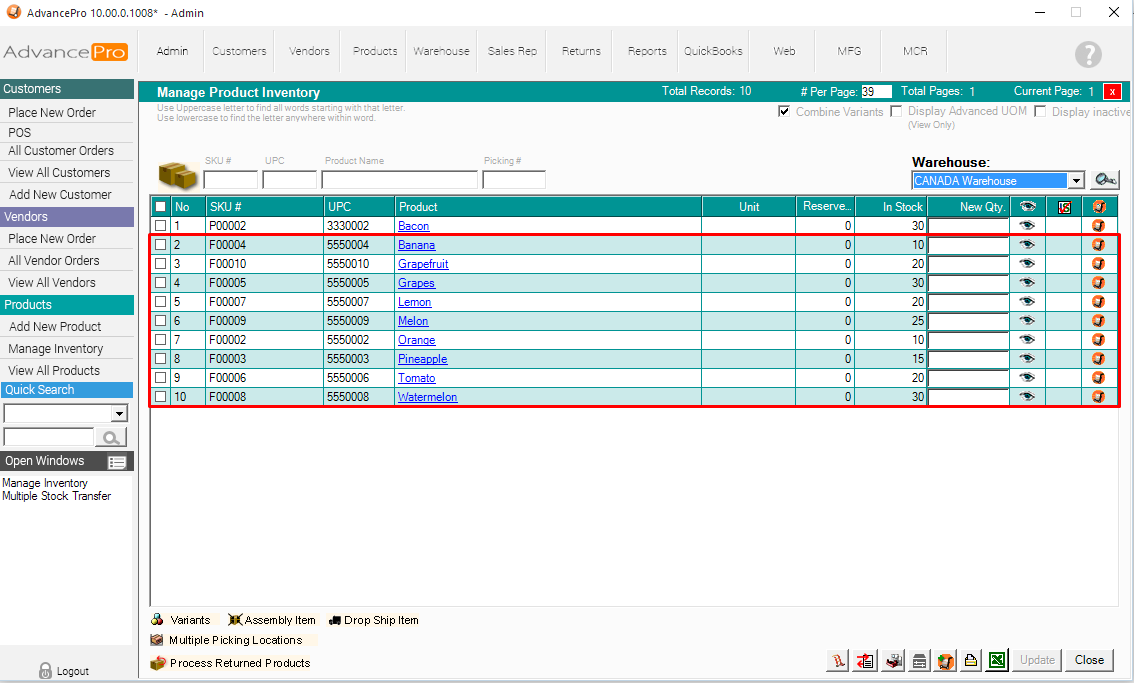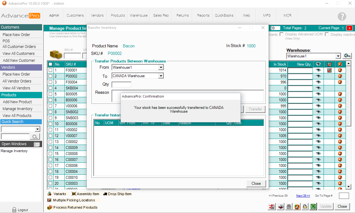 5. Go to Manage Inventory screen and select the WH to warehouse (from the multiple transfer window) and confirm that the products have been successfully transferred.