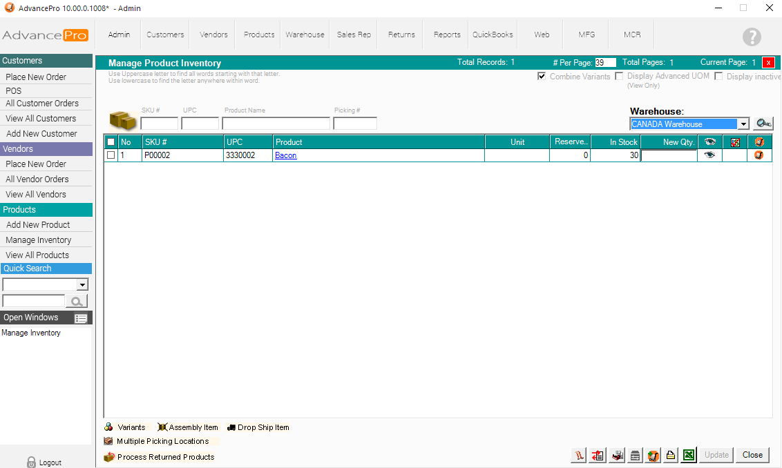 6. Product will now appear on this warehouse. (select this warehouse from Manage Inventory Screen)