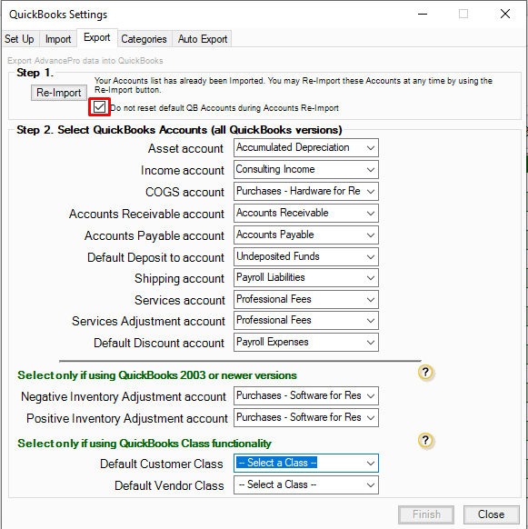 *Important! Make sure the "Do not reset default QuickBooks Accounts Re-Import" is checked.
