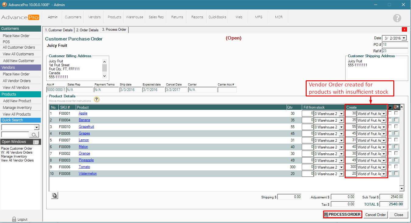 1. Customer Order (CPO) is placed and processed with Insufficient Stock, triggering a Vendor Order to be created.