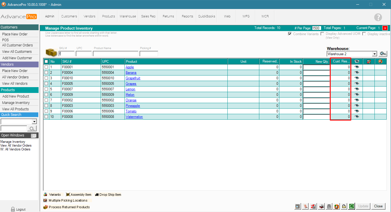 2. Products >> Manage Inventory - Customer Reserves are at ZERO