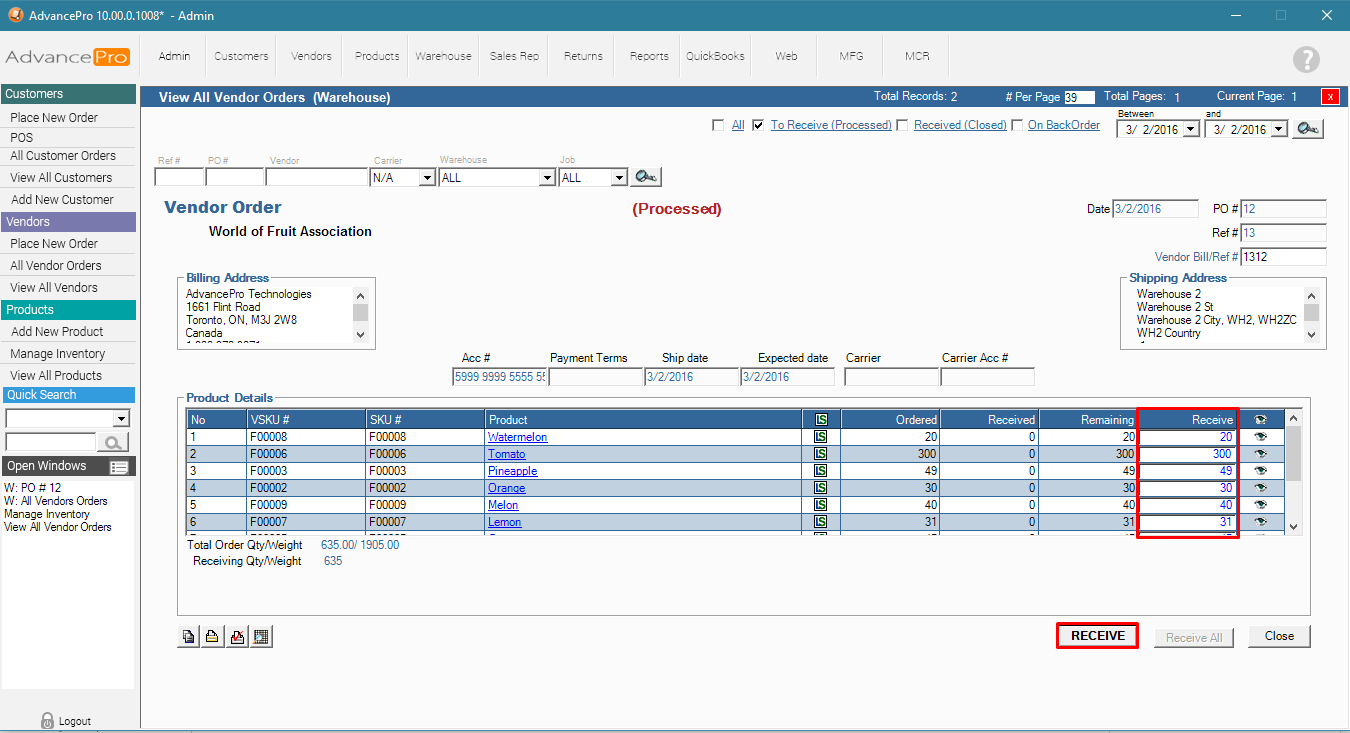 3. Receive the corresponding Vendor Purchase Order (VPO) to your warehouse