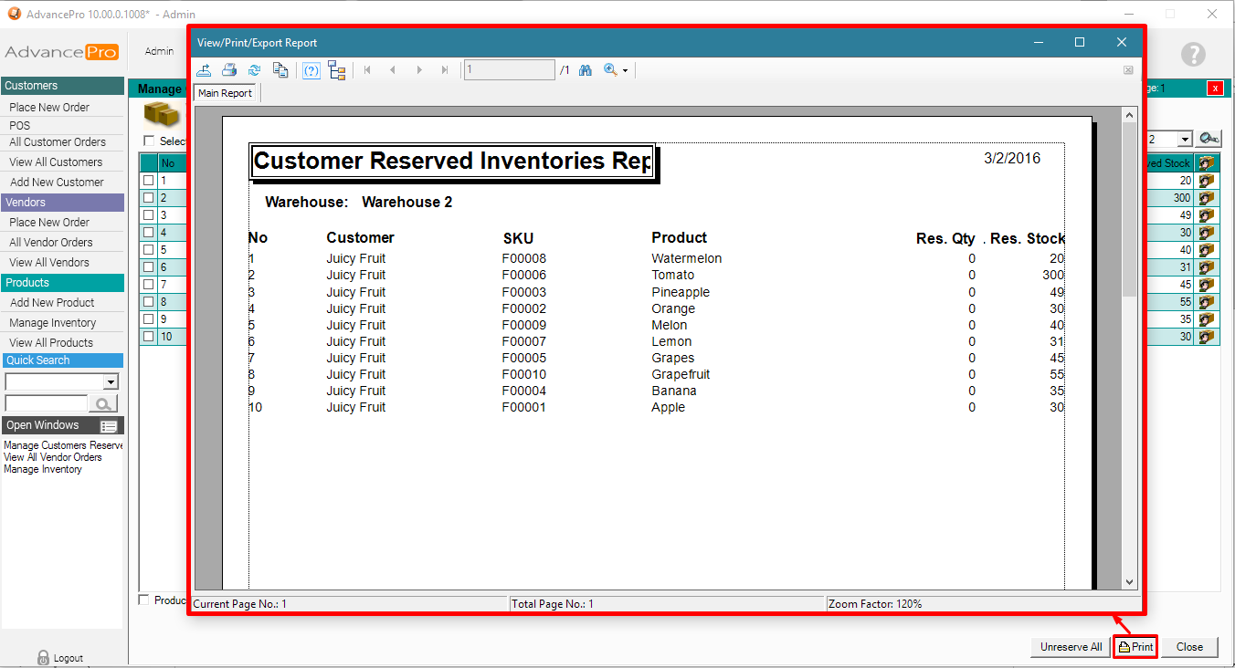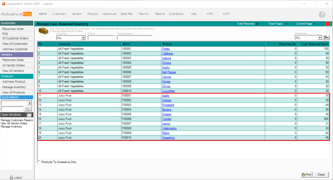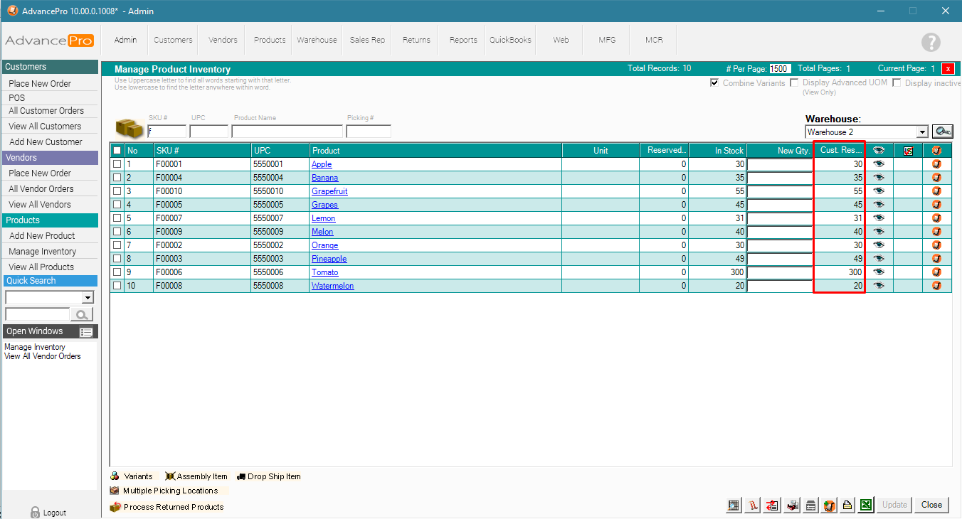 6. You can filter by Customer, SKU#, Product Name, and Warehouse