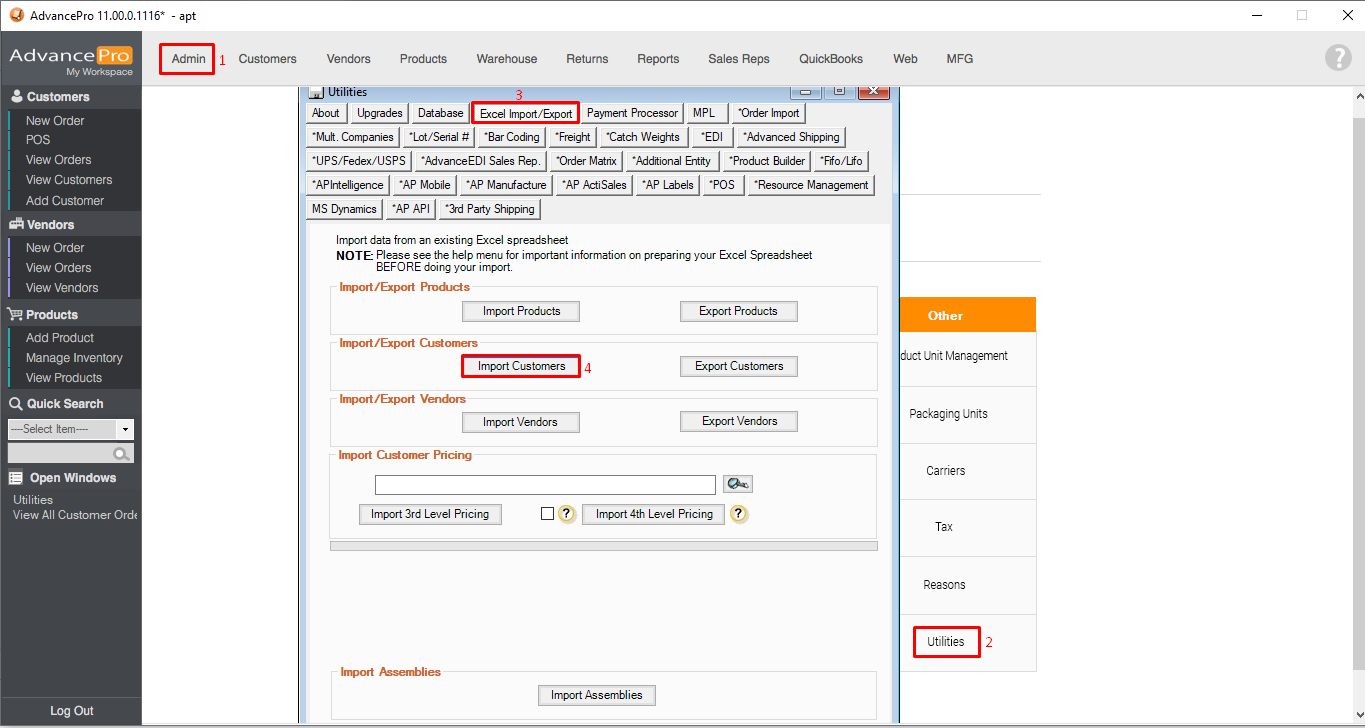 2. To import customers, go to 'Admin' switchboard > Utilities > Click 'Excel Import/Export' > Import Customers.