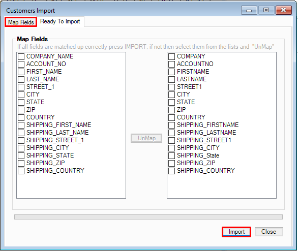 In the instance that you have mapped the wrong fields, you can choose to 'UnMap' these fields. Click the box corresponding to the field both in the LEFT and RIGHT fields and click 'UnMap'. Then in order to 'Map' the fields again, go back to 'Map Fields' and 'Map' fields as you see fit.