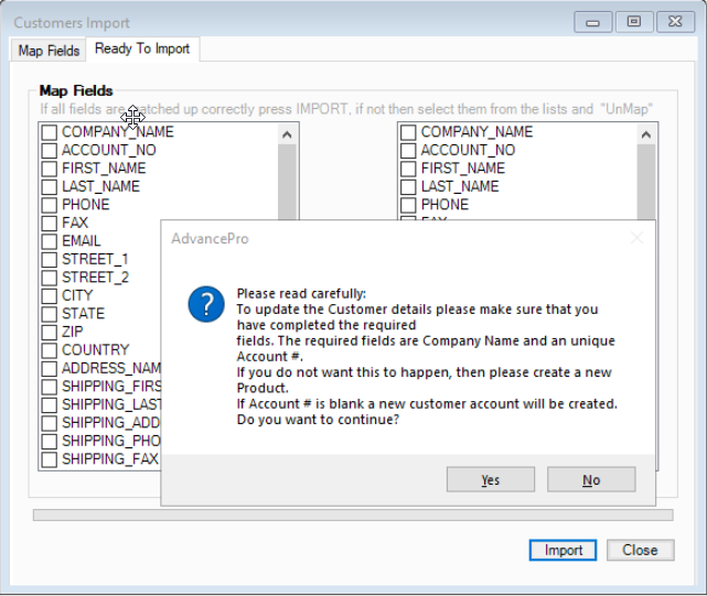 3. Browse the file to import; upon having the file on AdvancePro, your Excel fields would show on the RIGHT box. Match the AdvancePro fields on the LEFT with your Excel fields on the RIGHT and press MAP individually.