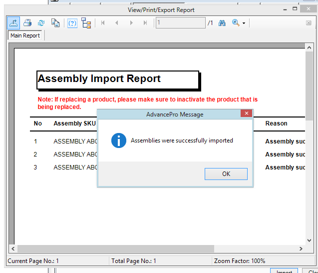 You will see a report of the imported assembly items and their corresponding error messages (usually if the components do not yet exist on AdvancePro) or you may see "Assembly successfully imported" if it goes through with no issues.