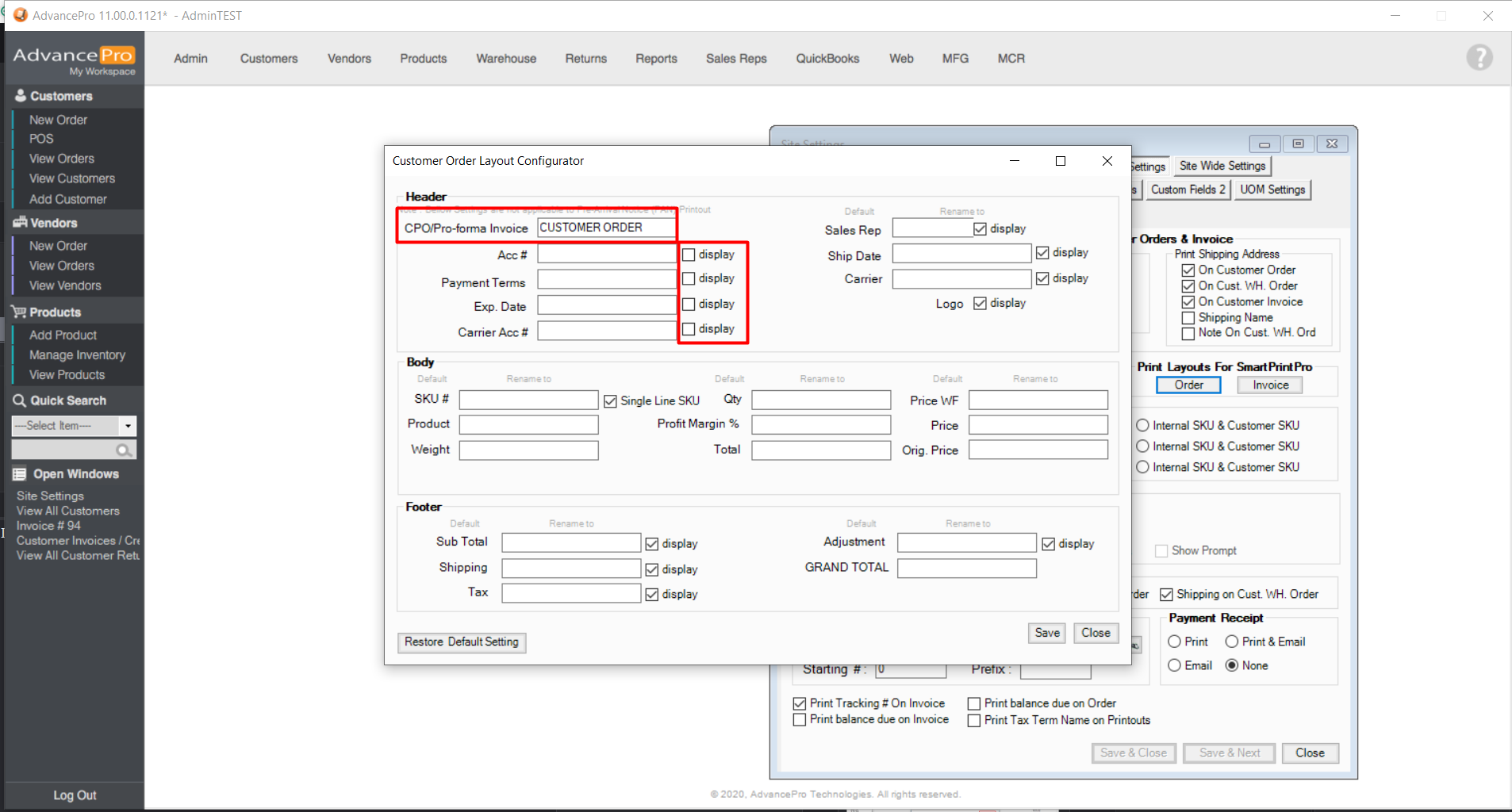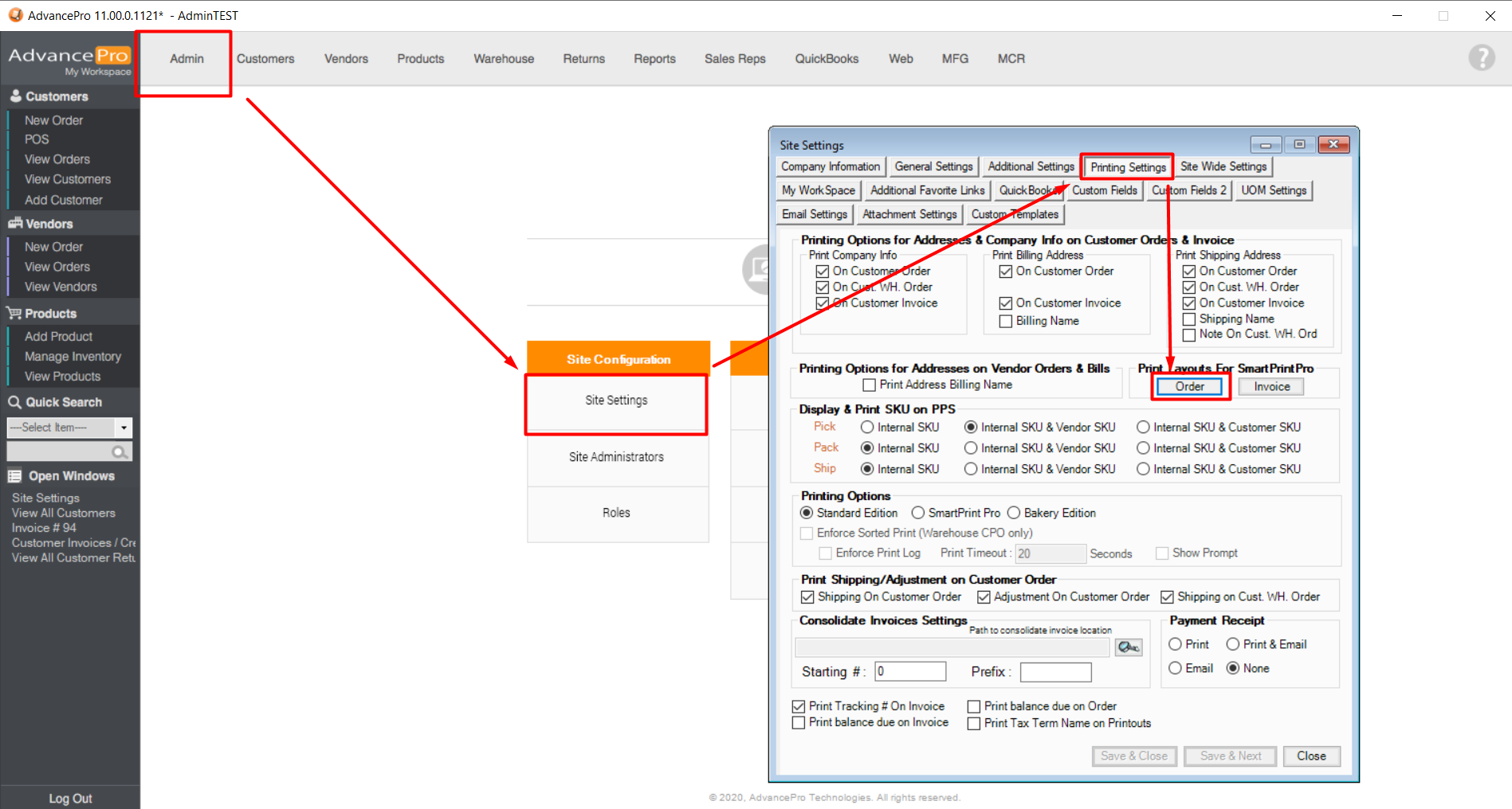 1. Go to Admin>>Site Settings>>Print setting>>Print layout for SmartPrint Pro