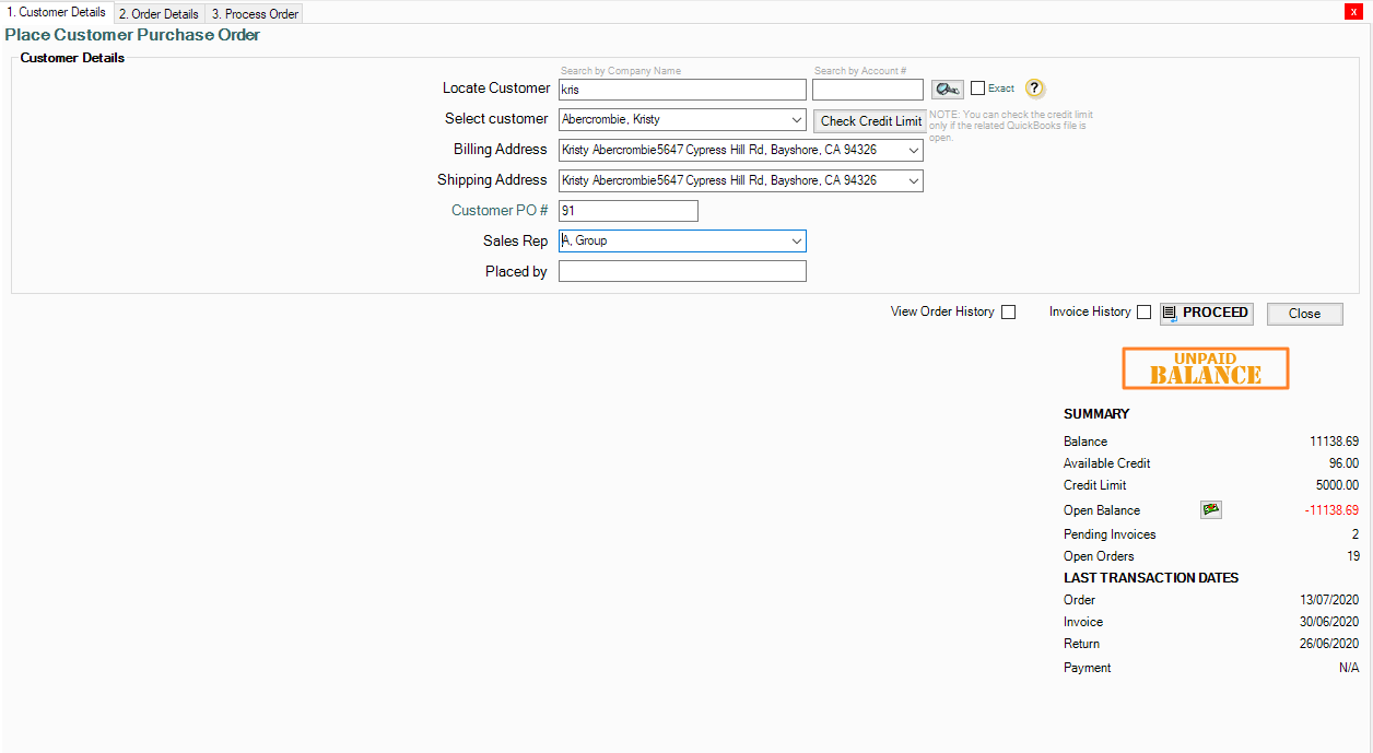 When connected with QuickBooks, you may also check their Credit Limit by clicking on the Check Credit Limit button beside the customer name.