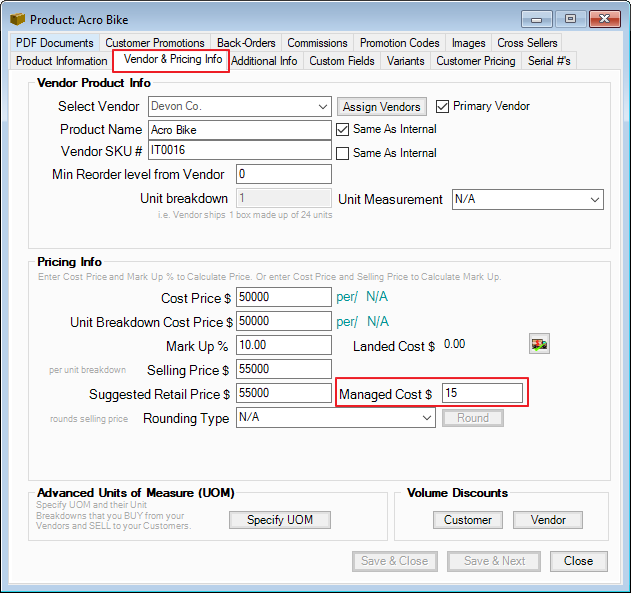 3. Navigate to the Vendor & Pricing Info tab and enter the Managed Cost