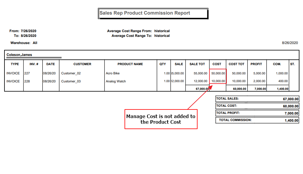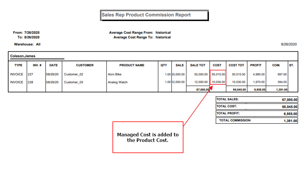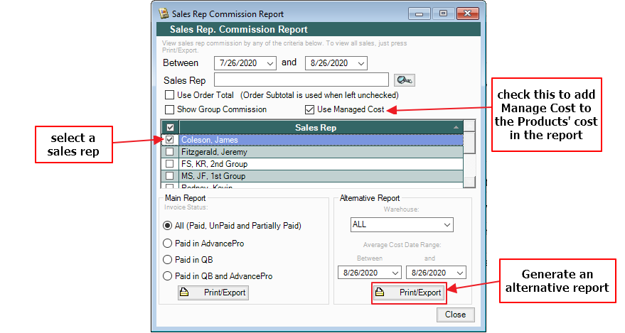 2. Select The Sales Rep you want to print the report for, and check Use Managed Cost