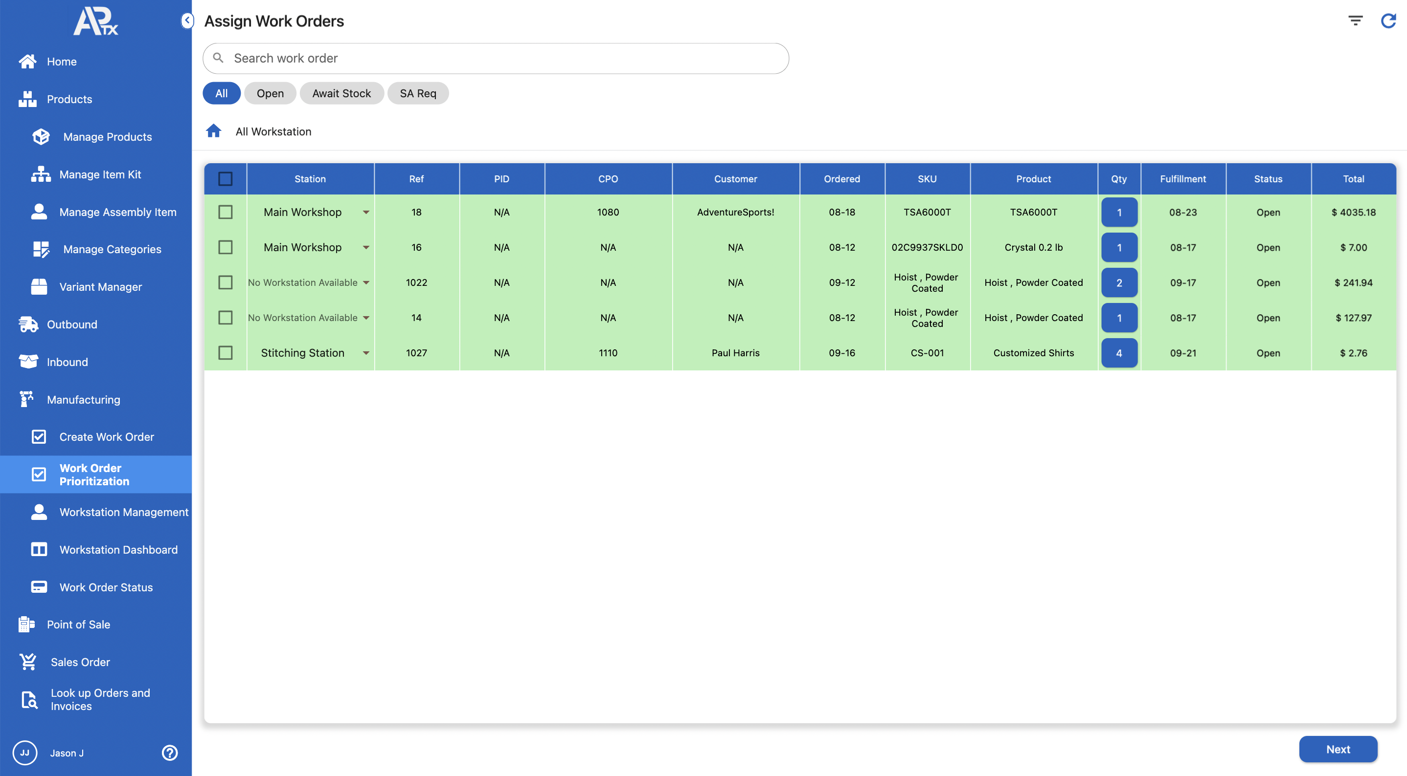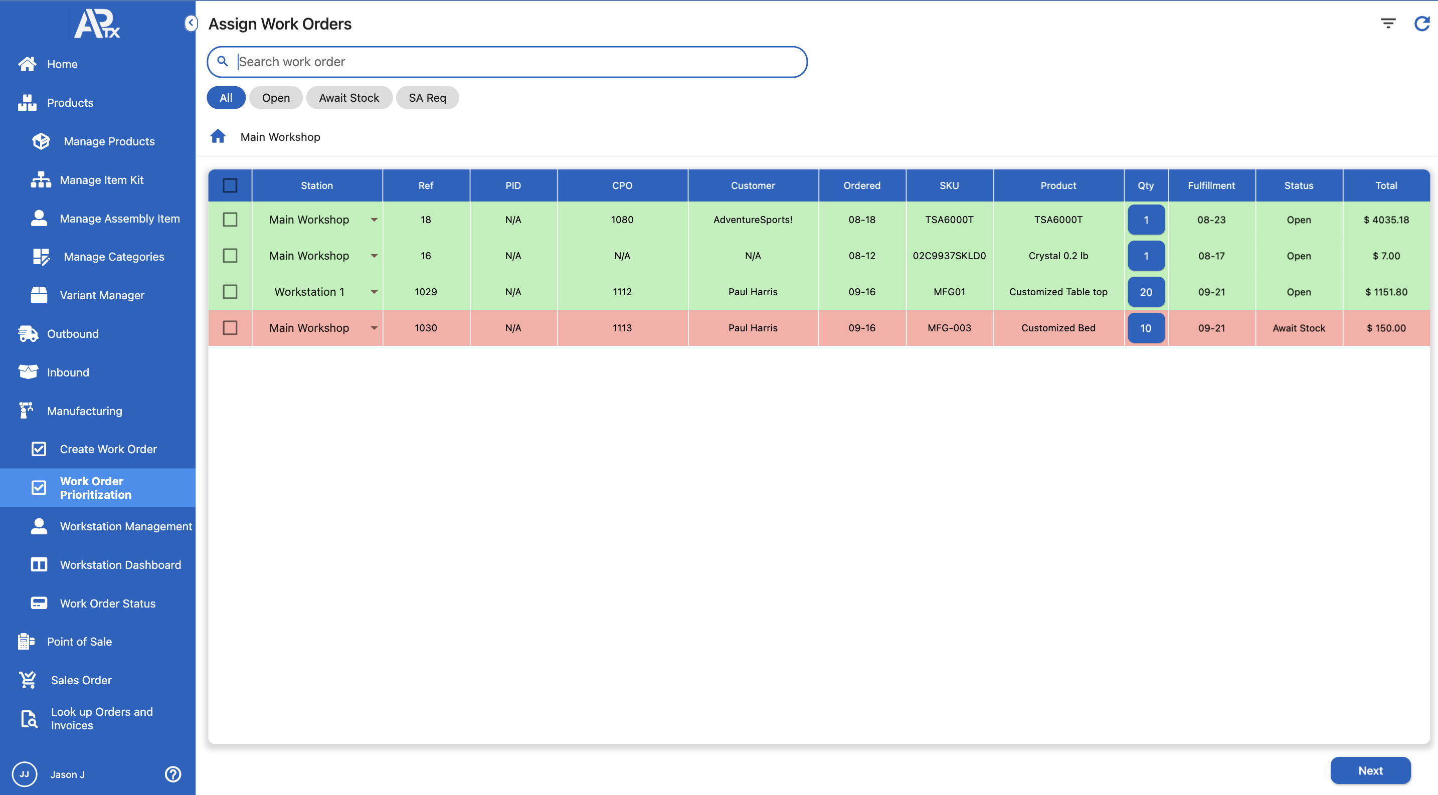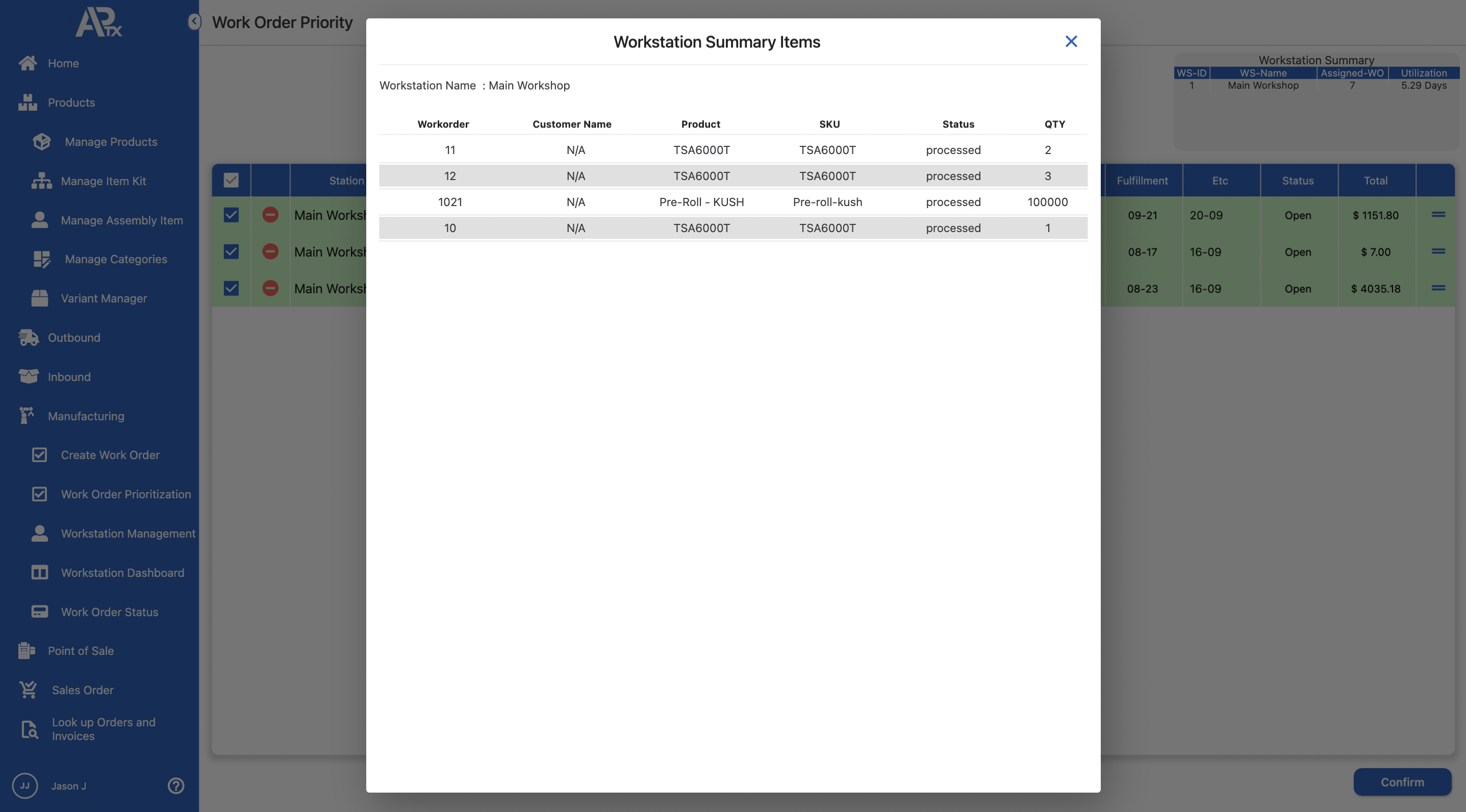 The APTX manufacturing module is a set of tools that allow a production manager to manage, prioritize, assign, and track work orders. A workstation user can also utilize the manufacturing capability to pick, assemble, and finalize work order