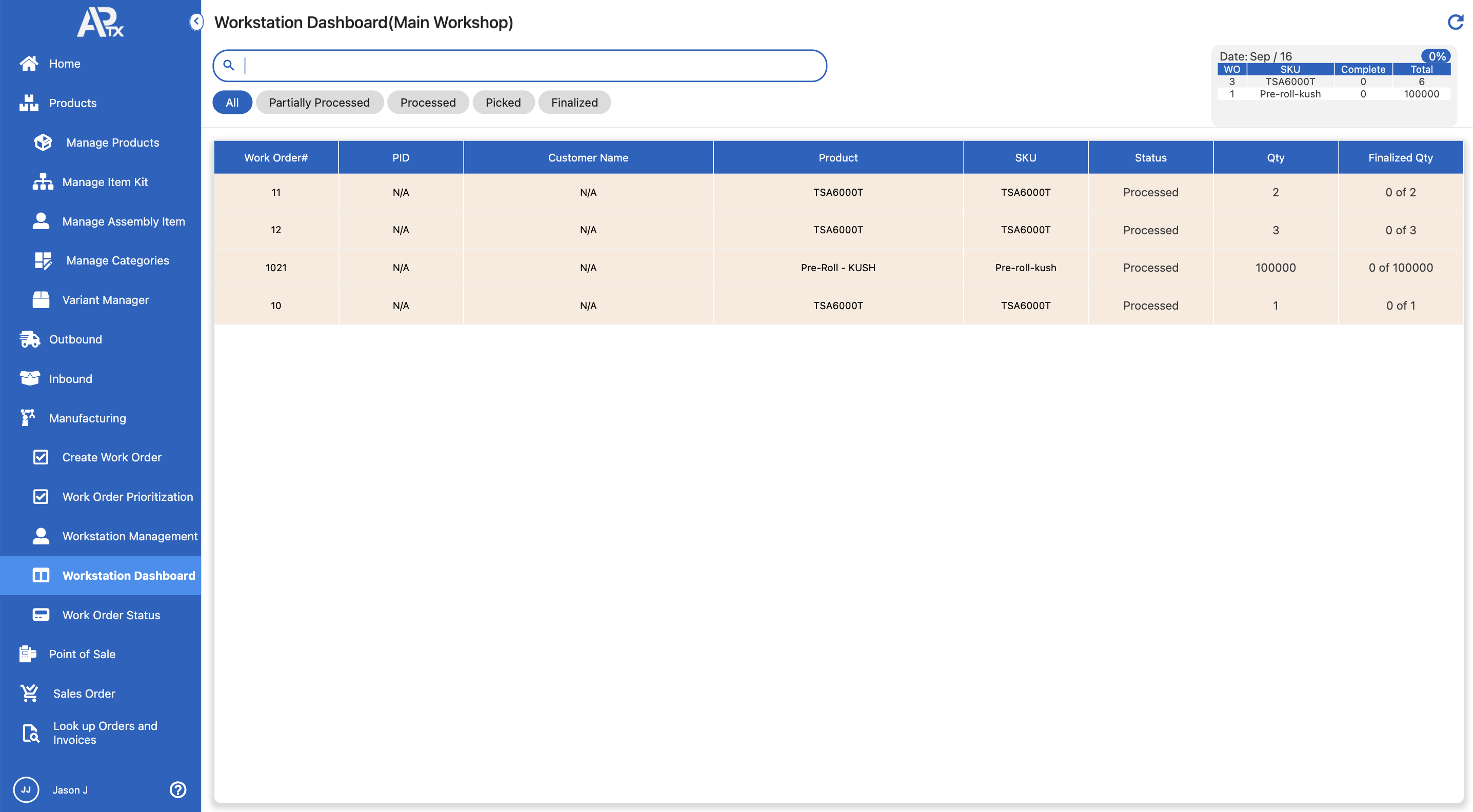 - Processed - shows all the work orders in the processed stage that have been assigned to the workstation