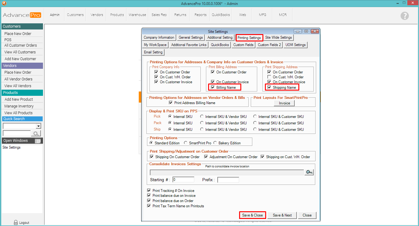 3. Under "Print Billing Address" and "Print Shipping Address", Check "Billing Name" and "Shipping Name" and click Save and Close