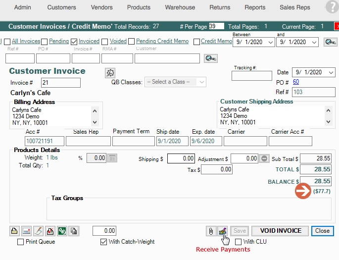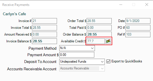 4. If there is an available credit balance on the account 'Available Credit $' and 'Receive Payments' icon will show.