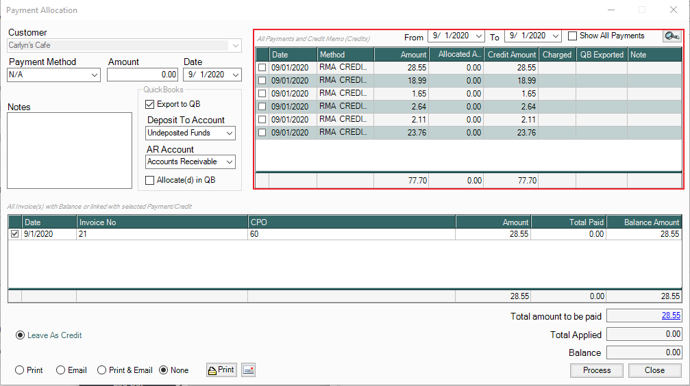 5. Clicking the Receive Payments icon will bring up the Payment Allocation form, with the available credit(s) (highlighted in red).