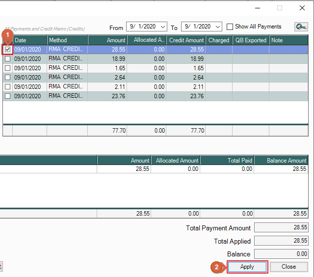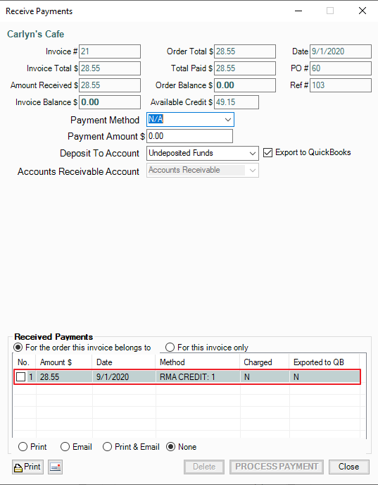 7. After closing the Payment Allocation form, the applied credit should reflect at the bottom, under Received Payments.