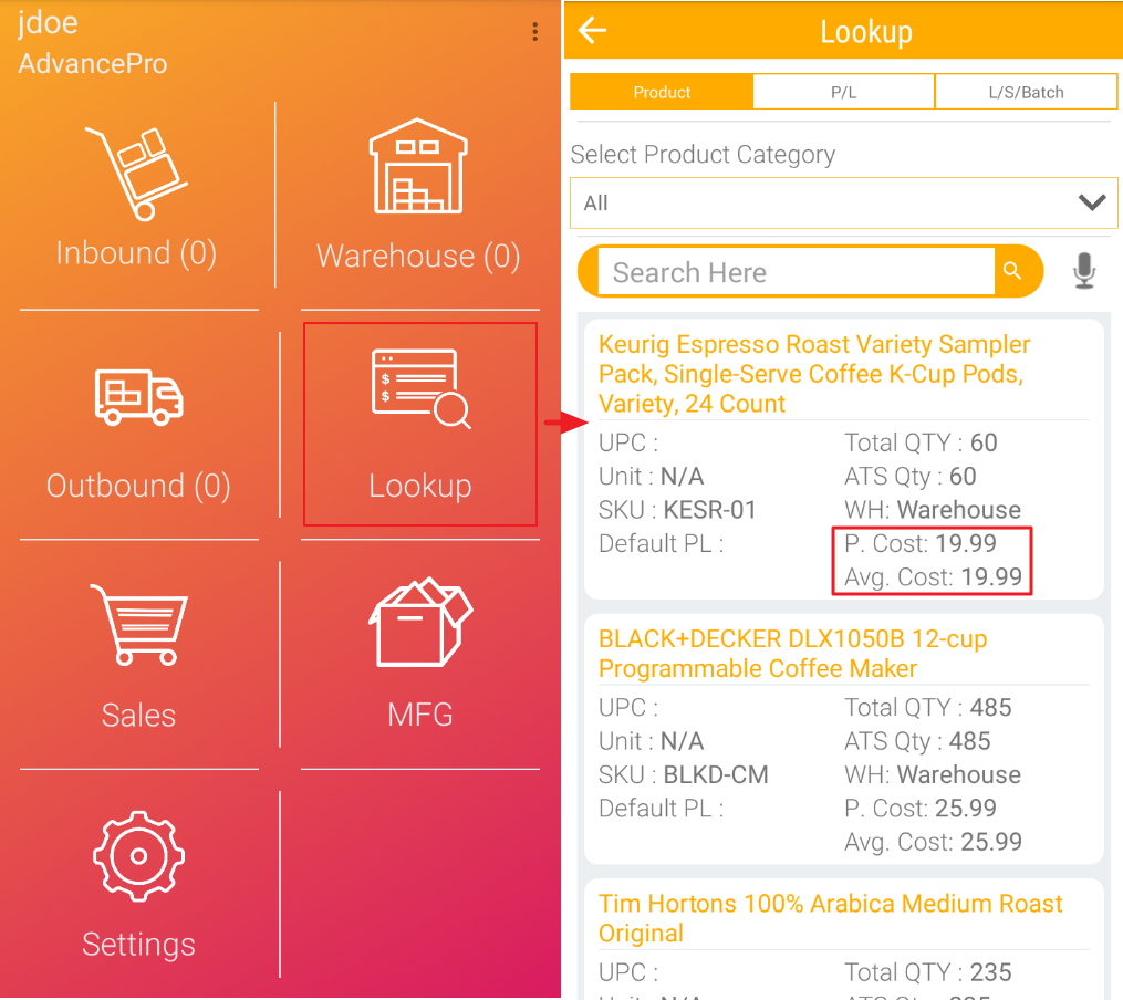 - Once these options have been enabled, you can now see the Product & Average Cost on its respective Activity. Go to the main screen and tap on Lookup.