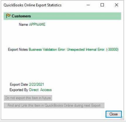 Exporting customer and getting the error "Business Validation Error: Unexpected Internal Error. (-30000) in QuickBooks Online.
