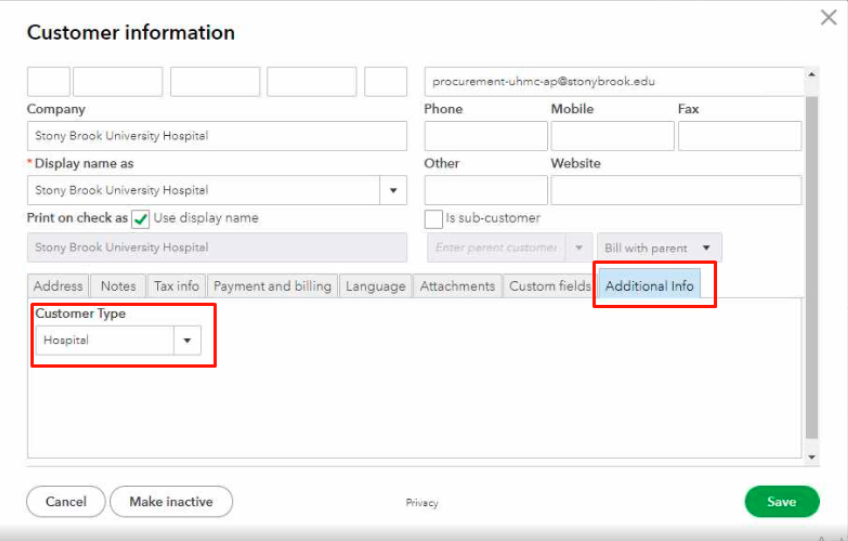 Verify in QuickBooks Online if customer information has a value in "Customer Type".