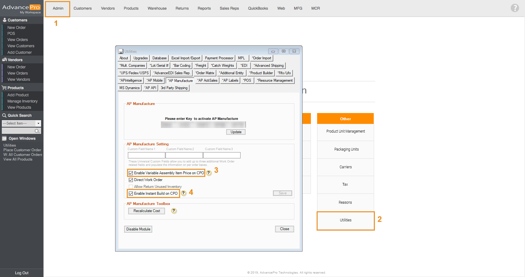 - To be able to create a Work Order via CPO, user must enable the following settings. Go to Admin > Utilities > AP Manufacture > Hit Save.