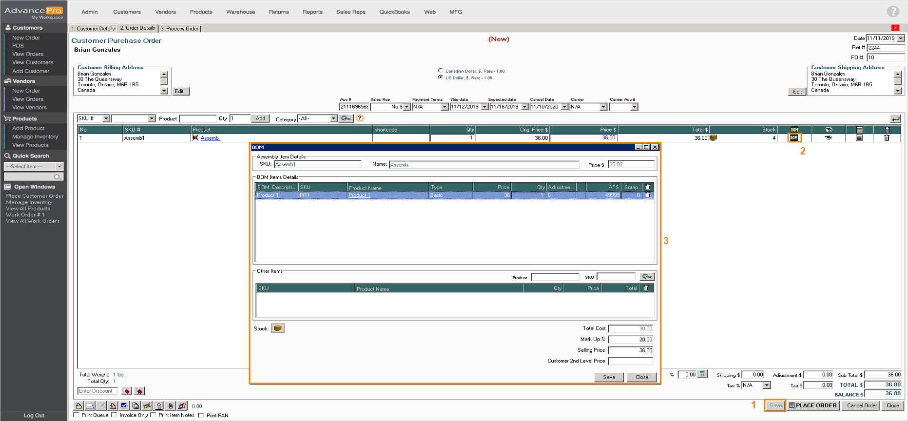 - In order to open the BOM window, you must first click on save found at the bottom of the CPO.