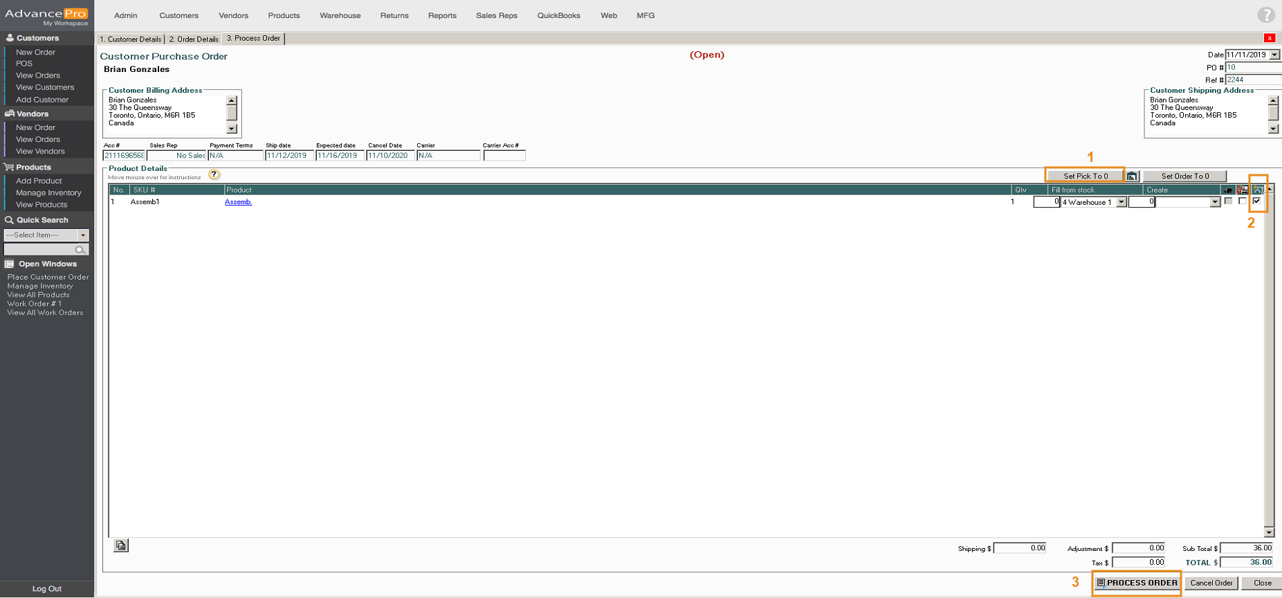 - After placing the order, click on the 'Set Pick to 0' option, click on the 3rd checkbox to the right to process the Instant Build and Process the order as seen on the screenshot below.