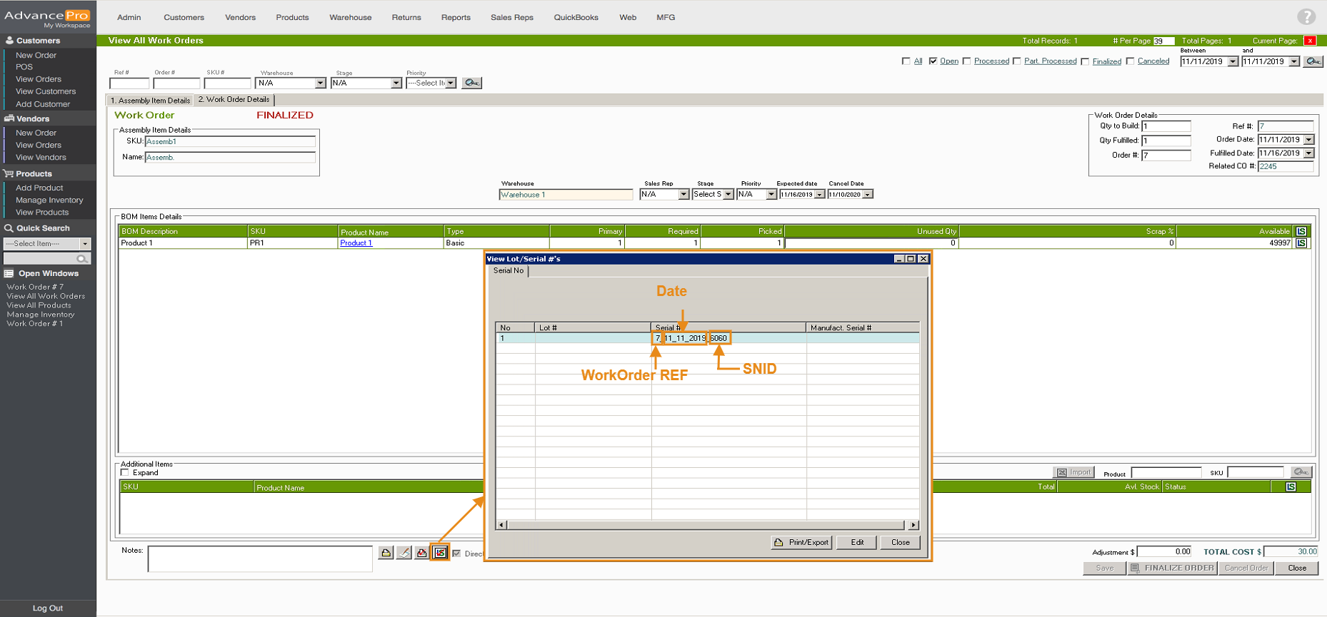 Note: Please make sure components of the assembly items have Serial Numbers. -