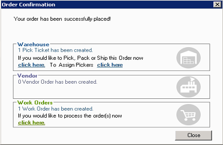- An order confirmation will pop up. The user is given two options, a Pick Ticket, and a Work order.