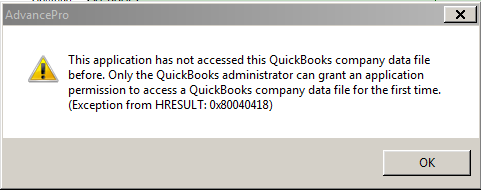 This application has not accessed this QuickBooks company data file before. Only the QuickBooks administrator can grant an application permission to access a QuickBooks company data file for the first time. (Exception from HRESULT: 0X80040418)