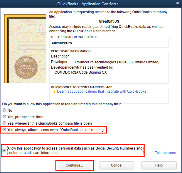 This will trigger the QuickBooks Application Certificate screen. Select "Yes, always; allow access even if QuickBooks is not running"