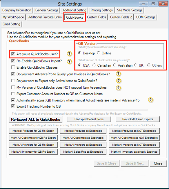 - My Version of QuickBooks does NOT support Item Assemblies - This causes item kits in AdvancePro to export to QuickBooks as non-inventory items. Enable this option if you are using QuickBooks Pro or an older version that does not support assembly items.