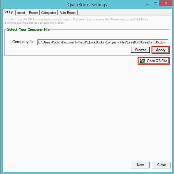 4. Temporarily close the QuickBooks company file if it is currently open, then click ‘Apply’ and ‘Open QuickBooks File'