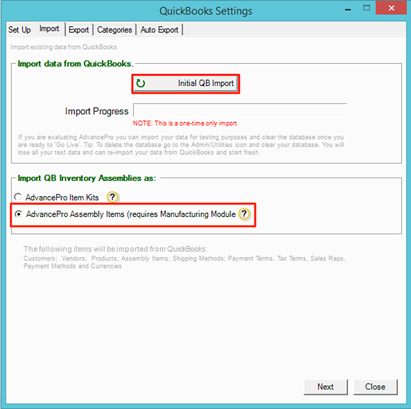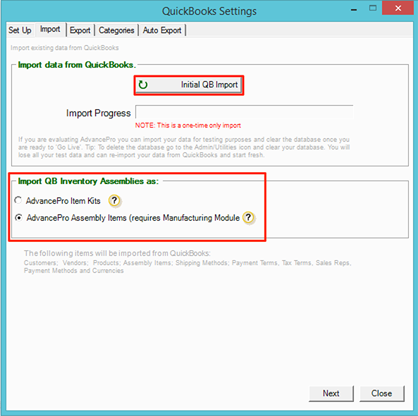 1. To repeat the import process, go back to the ‘Import’ tab, select the ‘AdvancePro Assembly Items’ option and then click the ‘Initial QuickBooks Import’ again.