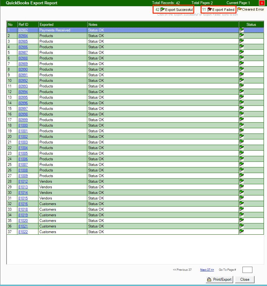 5. If there are any items that failed to export, you can click the blue "REF ID" number for each line to see more details of the problem. Resolve those issues as necessary and repeat the export process until there are no more failed items shown.