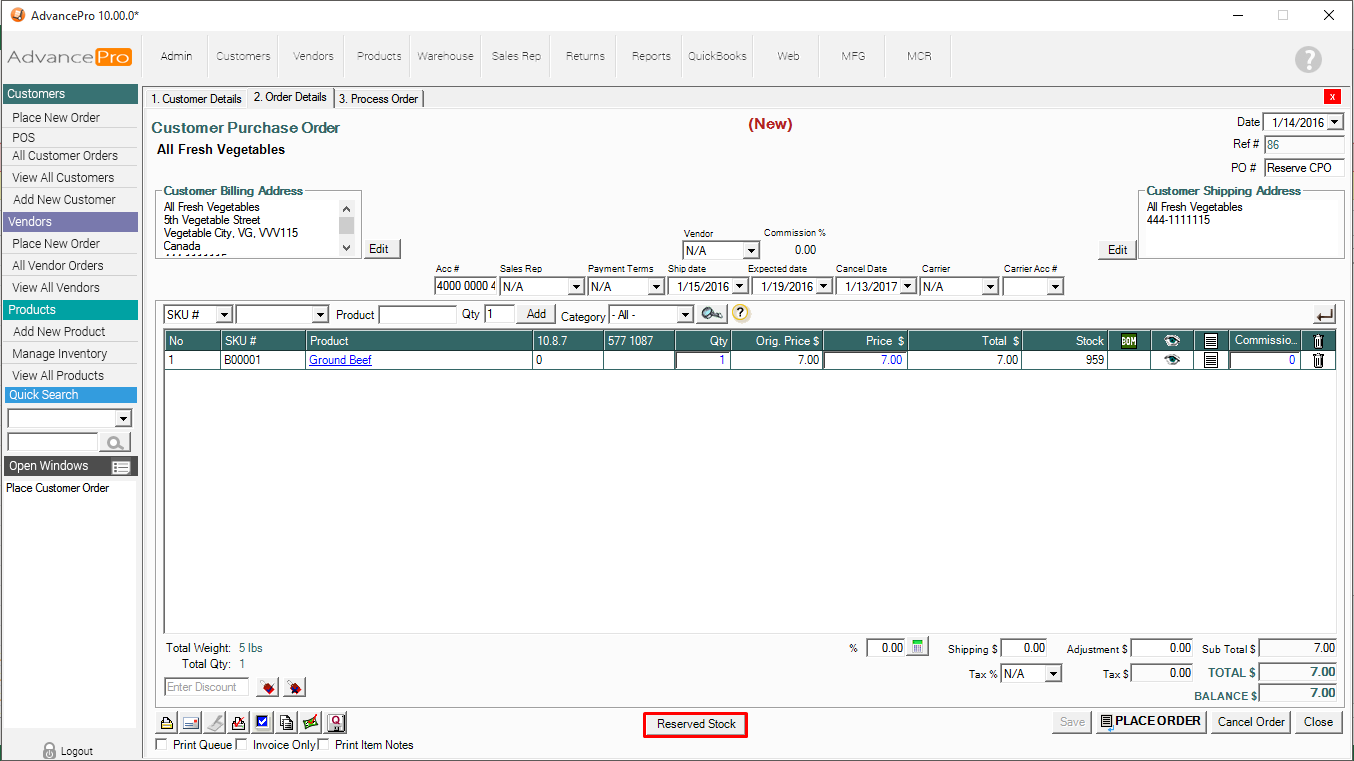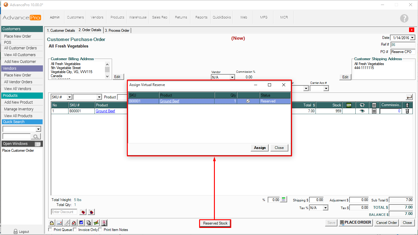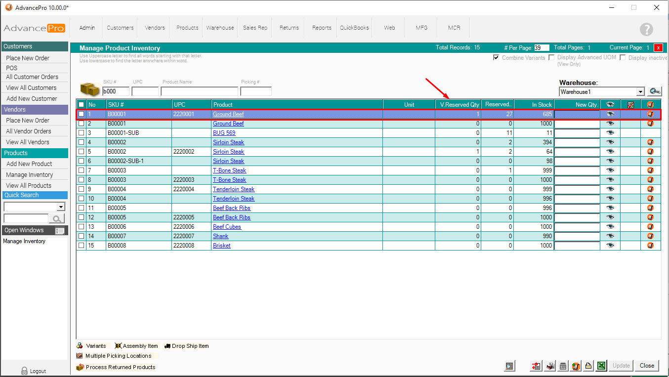 Reserved quantity can also be viewed from the Products > Manage Inventory in the V.Reserved Quantity column.