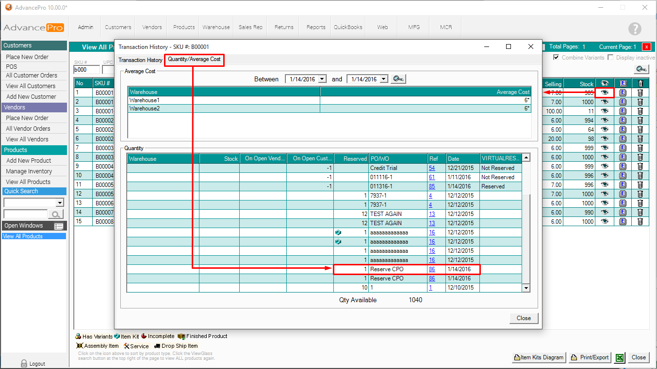 To view the reserves on any product, click Products > View All Products > the eye icon for any line item > Qty/Average Cost tab. Here you will see the quantity reserved on an open customer orders.