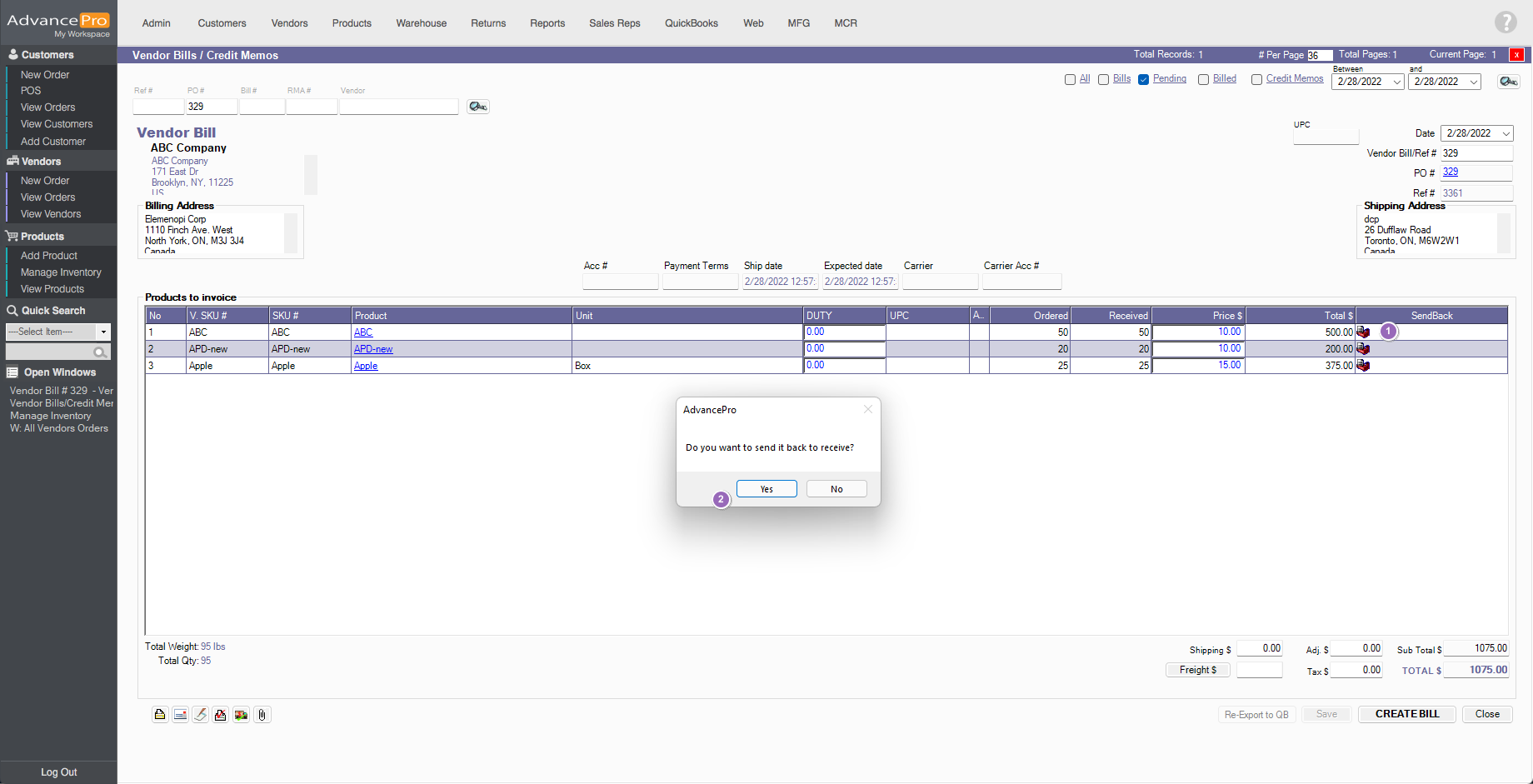 AdvancePro has added the ability to send a pending bill back to the warehouse.