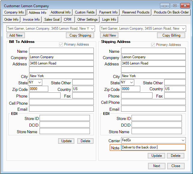AdvancePro has added an ability to print or display notes on Shipping slips. This functionality can be used for leaving special instructions needed by the delivery person and are specific per shipping address.