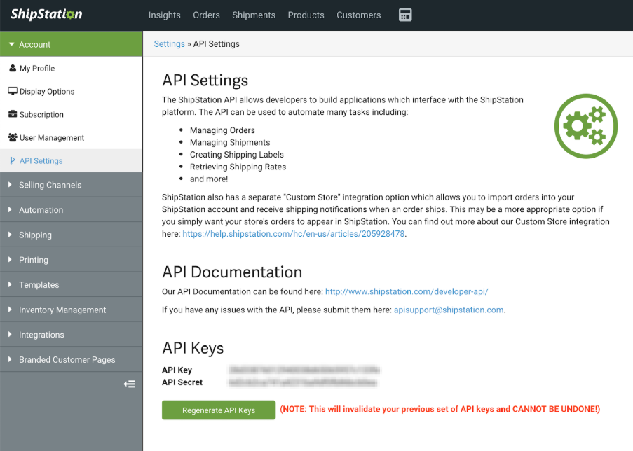 - Log in to your Shipstation account and go into Account Settings (wrench icon on top-right menu) > Click Account > API Settings. This will show the set of keys that will need to be entered in AdvancePro in step 3.