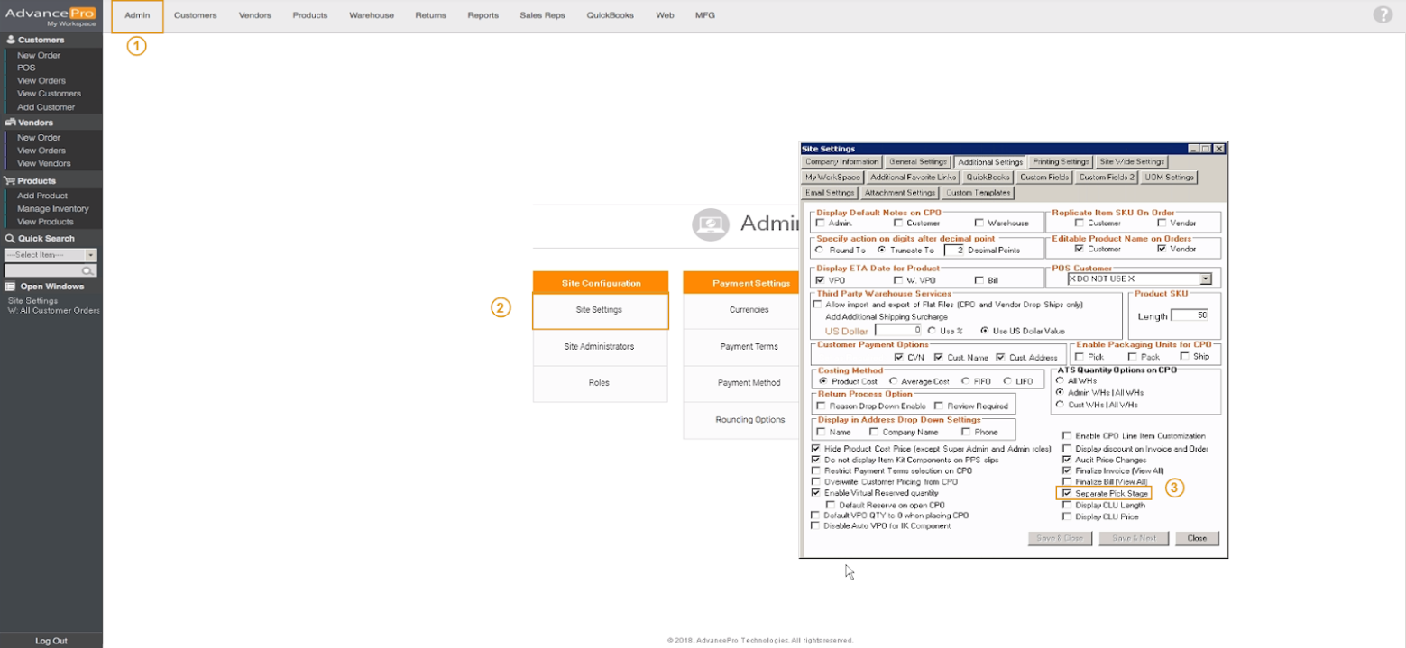 - Login to AdvancePro and go to Admin > Site Settings > tick Separate Pick Stage