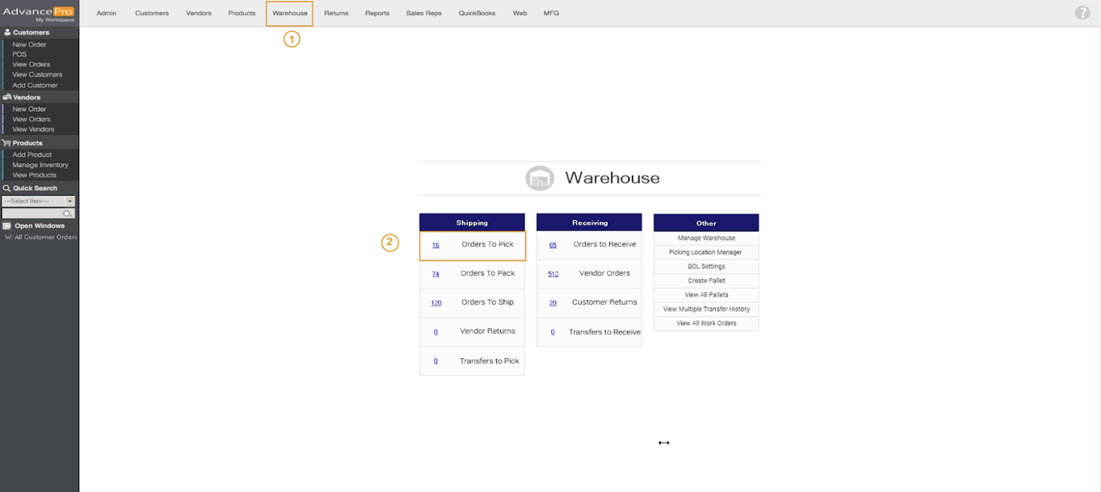 - After creating the orders, go to Warehouse and click on Orders To Pick to show the orders that are for picking