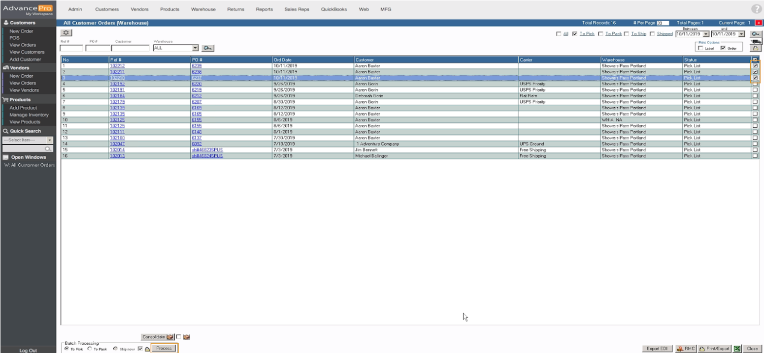 - Then select the orders that you want to process. At the bottom-left of the screen, you can see a Batch Processing option, click on Process
