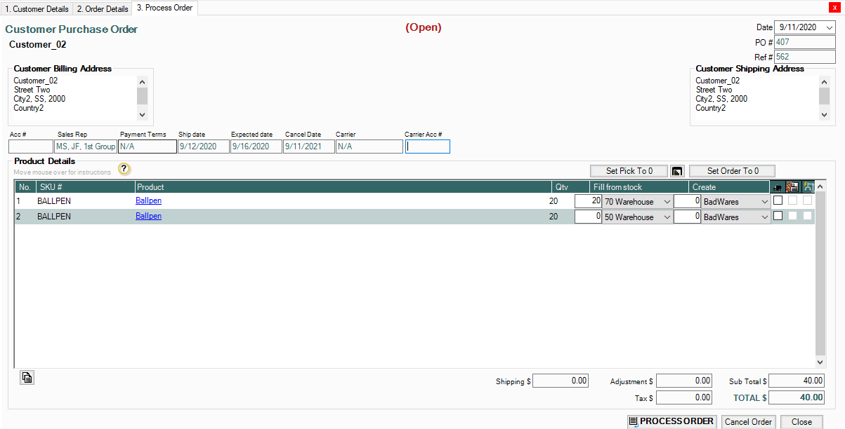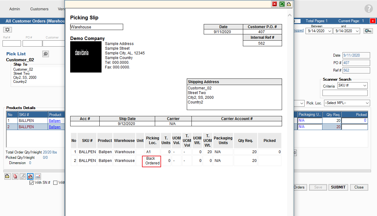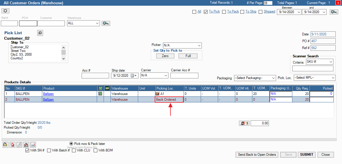 4. Open the Order in the Warehouse, the Item(s) that have not been filled will be marked as Back Ordered