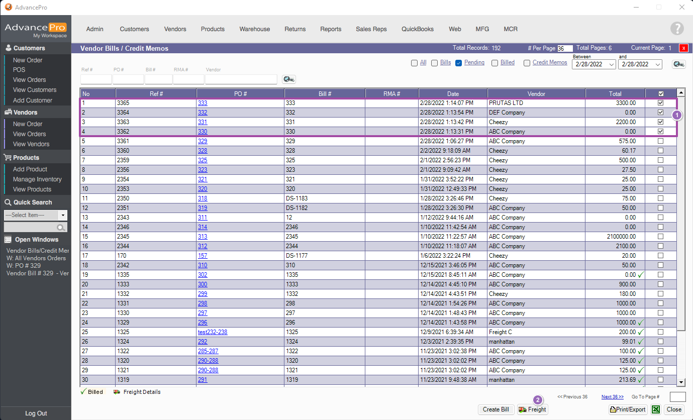 - Select the Pending Bills you wanted to create the freight bill from and click on Freight