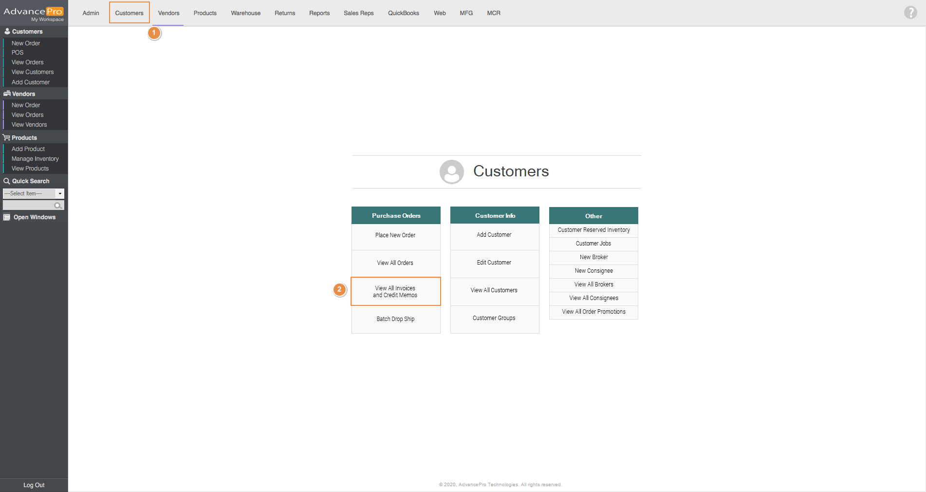 - After the return has been processed and received in the warehouse, go to Customers and click on View All Invoices and Credit Memos.