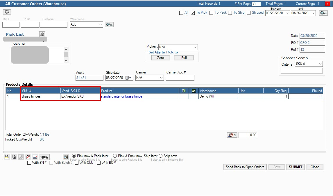 2. Internal SKU & Vendor SKU (on Pick, Pack and Ship)
