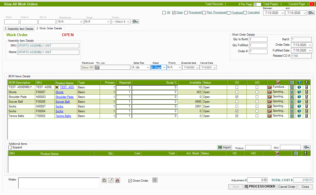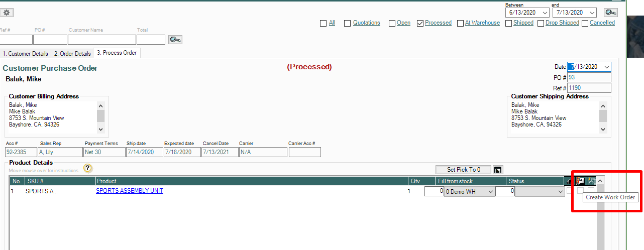 Create a Work Order directly from a Customer order screen when the Assembly Item is out of Stock